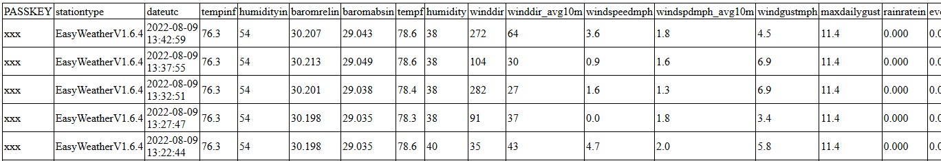 Was nicht funktioniert ist, dass man ein PHP-Script über einen Browser oder einen Cronjob aufruft und dadurch die Daten der Wetterstation direkt abgefragt oder angezeigt werden. Das ist allerdings problemlos in 2 Schritten möglich. 1. Daten empfangen und abspeichern. 2. abgespeicherte Daten auslesen und darstellen.
