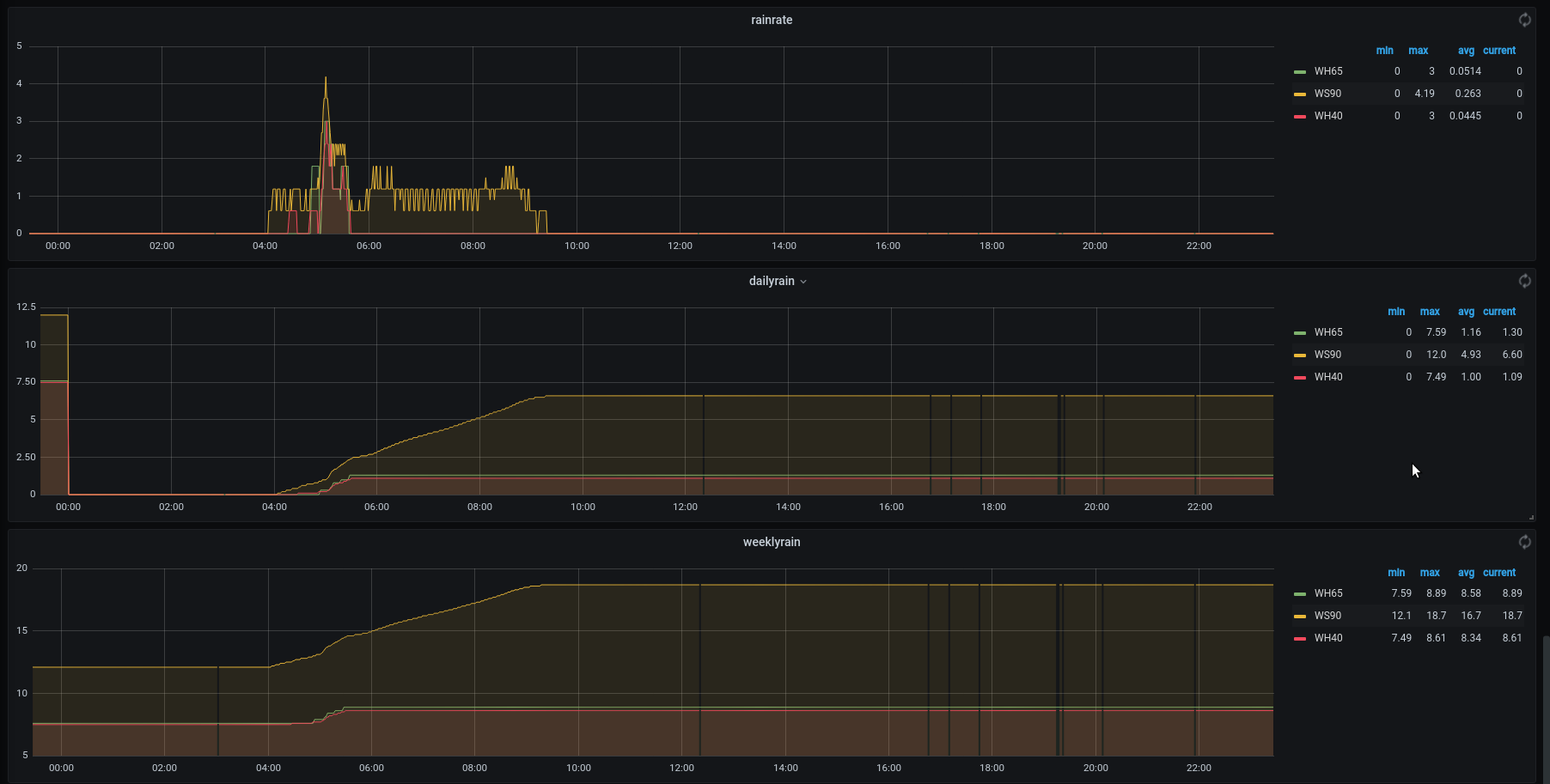 Man sieht an der Grafik aber auch, dass der WS90 deutlich frueher Regen erkennt: 04:04 Uhr waehrend die anderen Sensoren erst um 04:27 (WH40) bzw. 04:53 (WH65) eine Aenderung melden. Bei einem staerkeren Regen ist der Zeitunterschied nicht so gross - am Vortag hat es schnell recht heftig geregnet. Da meldete der WS90 um 11:58 Uhr und der WH40 bereits um 12:01 Uhr und schliesslich der WH65 um 12:03 Uhr Regen. Die Kipploeffel wollen eben erst gefuellt sein ...
