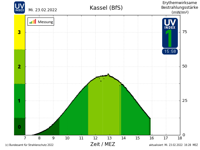 Ich hatte dann auch mal den Korrekturfaktor in der Konsole auf 0,98 gestellt was dann aber gleich sehr viel niedrigere Werte hier brachte und auch Auswirkung auf den UVI hatte. Dieser fiel dadurch von 2 auf 1, was aber laut BfS-Messung falsch war. Dort war heute von 11:30 bis ca. 13:45 der UVI durchgängig im 2er Bereich.