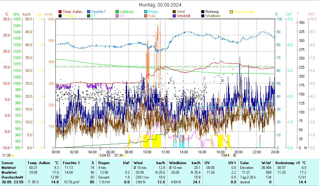Wind mittel 9,1 km/h - Böen Spitze 38,5 km/h W-SW
