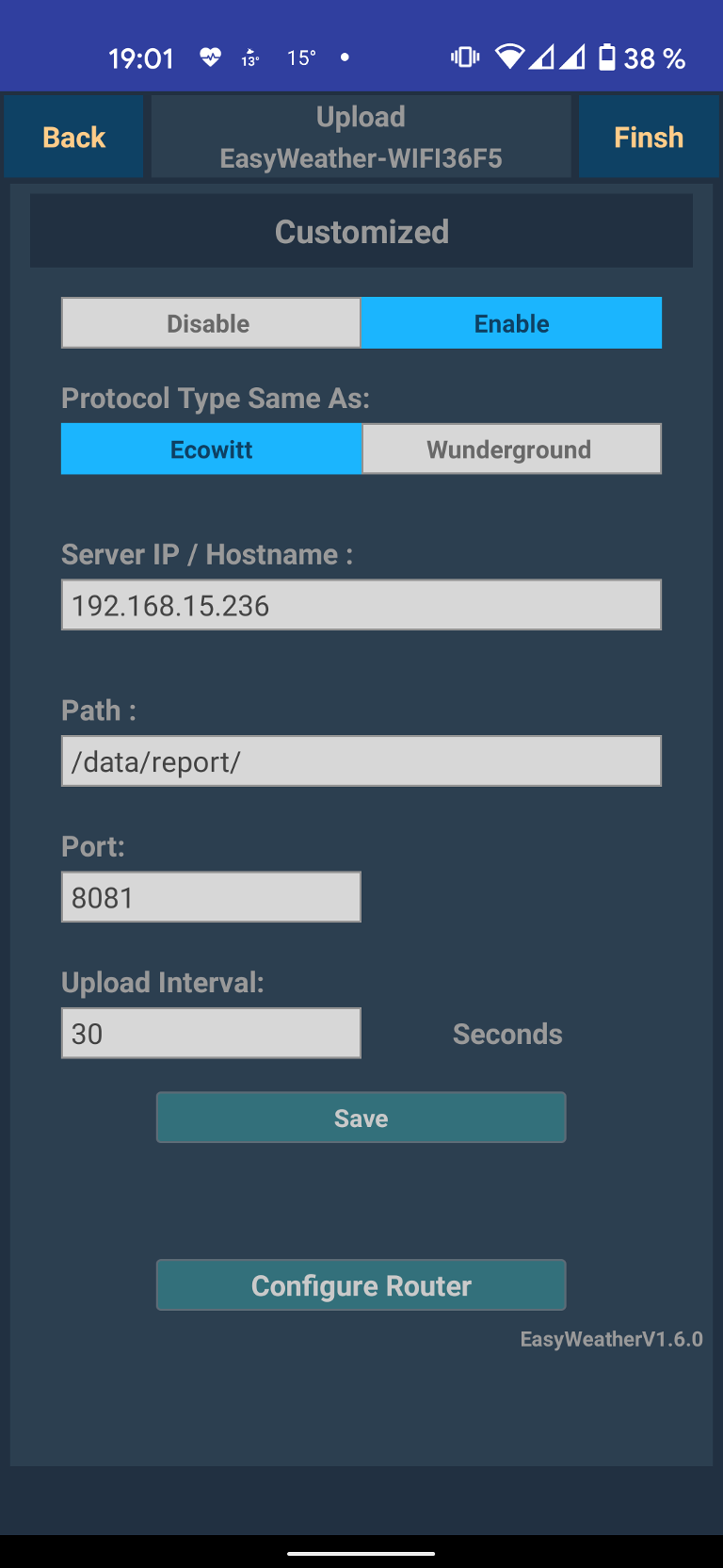 Device List --> EasyWeatherV1.x.x-WIFIxxxx --> NEXT mehrfach bis CUSTOMIZED erscheint