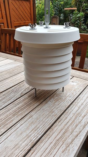 die genannte TFA Schutzhülle ist eher ein Wetterschutz als ein Sonnenstrahlenschutz. Für Temperaturmessungen im direkten Sonnenlicht ungeeignet. Ich habe diese (ähnliche) Sensoren (mit einem KlimaLogg Pro) zwar auch in diesen Schutzhüllen als Regen, Wind, etc. Schutz aber trotzdem abgeschattet.