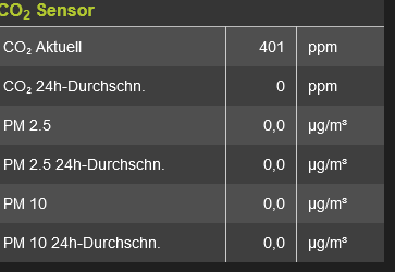 ,"co2_aqi_combo":{"co2":{"time":"1705517822","unit":"ppm","value":"393"},"24_hours_average":{"time":"1705517822","unit":"ppm","value":"579"}},"pm25_aqi_combo":{"real_time_aqi":{"time":"1705517822","unit":"µg\/m³","value":"66"},"pm25":{"time":"1705517822","unit":"µg\/m³","value":"19"},"24_hours_aqi":{"time":"1705517822","unit":"µg\/m³","value":"69"}},"pm10_aqi_combo":{"real_time_aqi":{"time":"1705517822","unit":"µg\/m³","value":"18"},"pm10":{"time":"1705517822","unit":"µg\/m³","value":"20"},"24_hours_aqi":{"time":"1705517822","unit":"µg\/m³","value":"20"}},"t_rh_aqi_combo":{"temperature":{"time":"1705517822","unit":"℃","value":"0.4"},"humidity":{"time":"1705517822","unit":"%","value":"79"}},Bei Dir werden die Werte ja in Cumulus angezeigt. Also muss es ja grundsätzlich gehen.