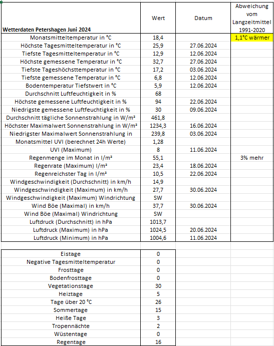 hier ein paar statistischen Werte zum Wetter in Petershagen (Märkisch Oderland) im Juni 2024. Im Monatsmittel waren die Temperaturen um gut 1°C wärmer als im 30-jährigen Mittel. 2 Tropennächte gab es bei uns, das ist im Juni sonst eher noch selten. Ansonsten gab es kaum Auffälligkeiten, auch die Regenmenge orientierte sich am langjährigen Mittelwert.