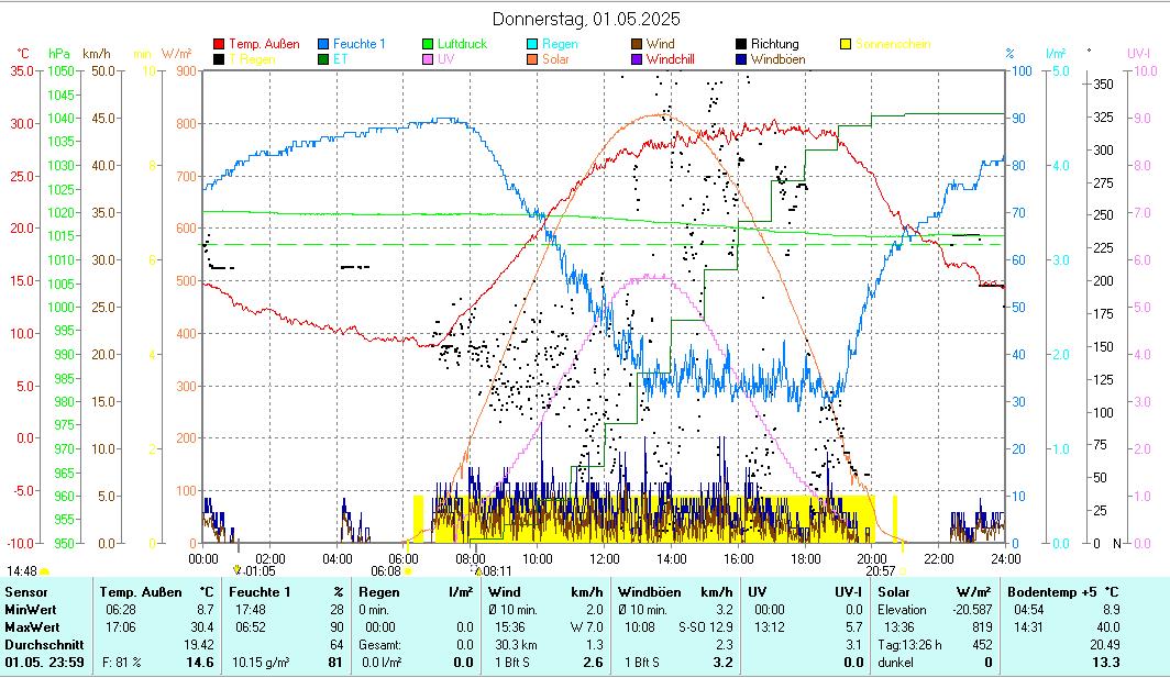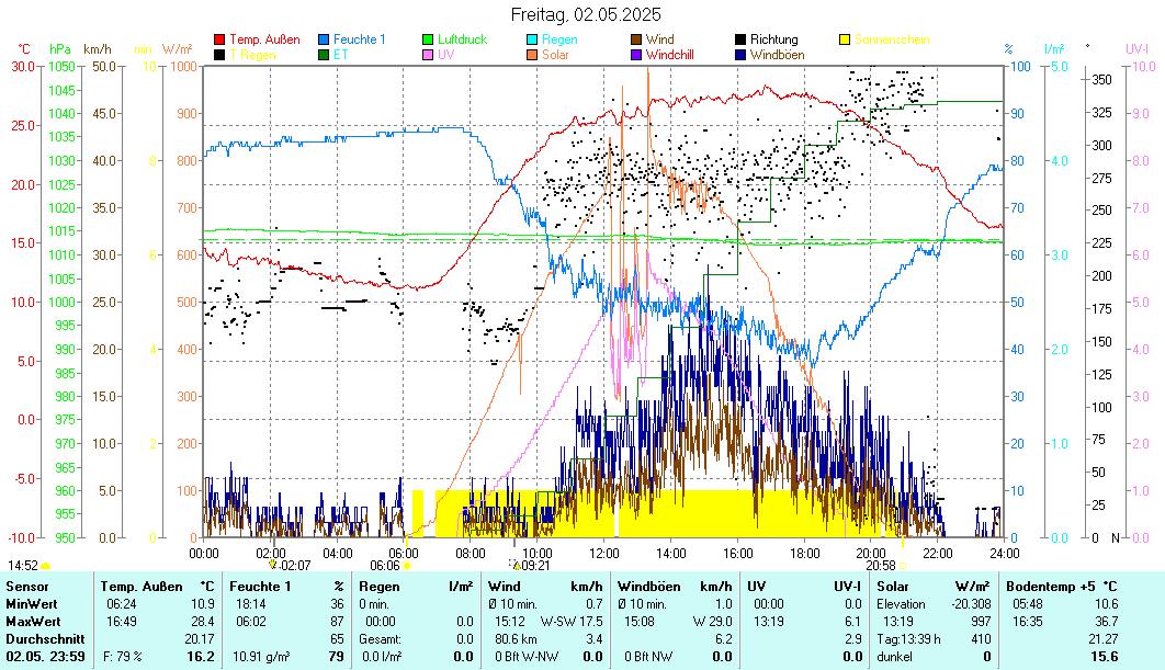 Windböen max 25,7 km/h N-NW min 0,0 km/h