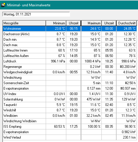Windgeschwindigkeit max 25,2 km/h SW min 0,0 km/h