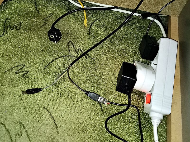 Auch habe ich gestern ausgiebig Fotos gemacht. Ich fange mal bei der Stromversorgung an: Unter dem Computertisch kommt die 4-adrige Leitung vom Dach an und teilt sich in 2x 2 Adern, welche jeweils einen USB-A Stecker aufgelötet bekommen haben. Die "Original Raspberry Pi 4" -Netzteile habe ich auch gleich modifiziert. Das Kabel wurde weit vor dem Leitungsschalter gekappt, abisoliert und eine USB-A Kupplung aufgelötet. Auf dem Bild fehlt noch das schicke, schwarze Gehäuse der Kupplung, was aber noch montiert wird. Über diese Leitung wird der Pi 4 mit der 8MP Webcam und der Switch versorgt. Die andere Leitung ist vorgesehen für den Pi 4 mit der AllSky-Kamera und dem SDR-Stick zum Satempfang, sowie für den LAN4ALL Antennenverstärker.