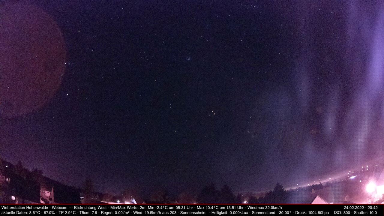 Die Webcam schaut inzwischen wieder gen Westen und stellt ihre Bilder auf der Homepage zur Verfügung. Auch die stündlichen und täglichen Zeitrafferanimationen werden wieder erstellt. Gerade Nachts machen sich die 4 Sekunden mehr an Belichtungszeit (alt bis 6 Sekunden, neu bis 10 Sekunden) deutlich bemerkbar. So viele Sterne wie letzte Nacht, hatte ich zuvor noch nie auf meinem Webcambild. Nachdem ich diese Bilder gesehen hatte, drehte ich die Webcam noch etwas nach links, um den störenden Lichtreflektionen der Straßenbeleuchtung aus dem Weg zu gehen.