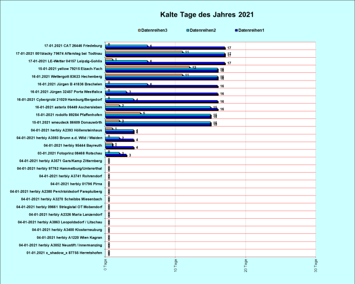 | Datum,User,PLZ,Ort | Kalte Tage Tmax<10 | Frosttage Tmin <0 | Eistage Tmax <0 |
