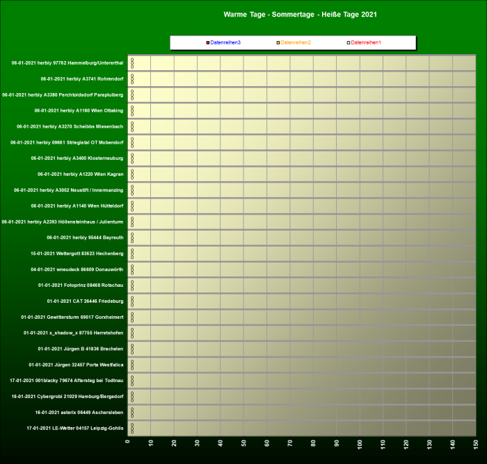 | Datum,User,PLZ,Ort | Warme Tage max>=20°C | Sommertage max>=25°C | Heiße Tage max >=30°C |