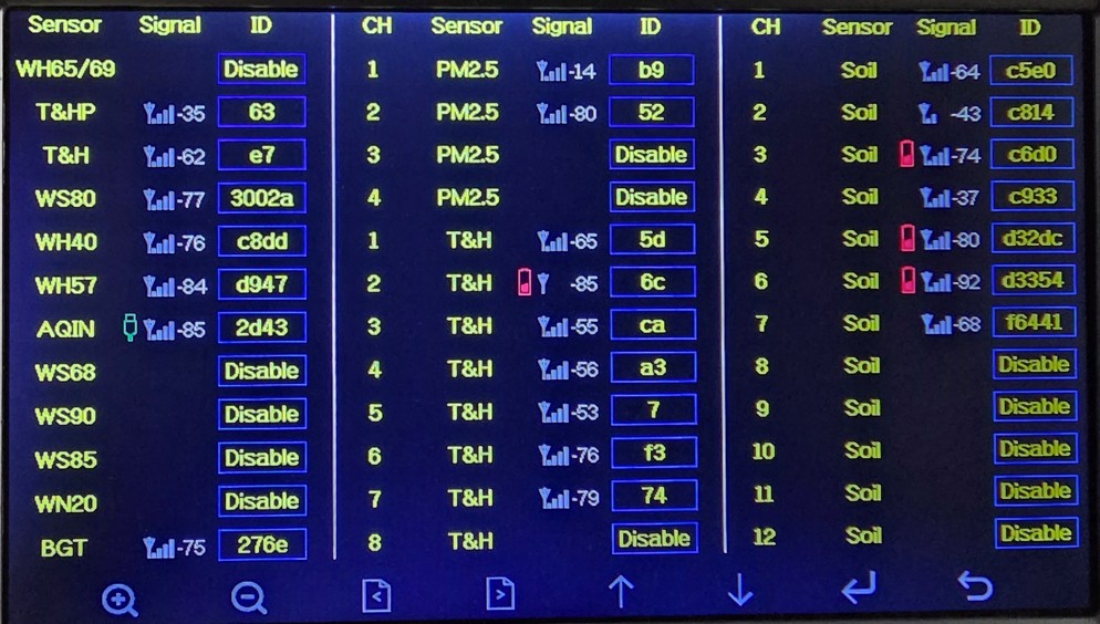 Dann folgen die Außensensoren 0x02 in aufsteigender Reihenfolge (mit ein paar Ausnahmen ): für eine Extra-Temperatur gibt es eine zugehörige Extra-Luftfeuchtigkeit, die nach dem 8. Extra-Temperatursensor zu zählen beginnt; auch die PM2.5 WH41-Sensoren sind etwas aus der Reihenfolge geraten - das liegt am historisch gewachsenen API). Eine Dekodierungssoftware muss diese Reihenfolge für eine korrekte Dekodierung kennen. Auch für die WH45-Werte muss die Byte-Reihenfolge, Größe und Zuordnung bekannt sein. Ein WH51-Bodenfeuchtesensor hat immer einen entsprechenden Bodentemperatursensor zum „Nachbarn/Nachfolger“) - und das API erlaubt 16 Bodenfeuchtigkeits- und 16 Bodentemperatursensoren (und 8 Benutzer-Temperatursensoren), aber die Konsolen-Firmware erlaubt (bisher) nur 8 WH51-Bodenfeuchtesensoren. Die verbleibende 8 sind ungenutzt. Die 16 Bodentemperatursensoren sind bislang komplett ungenutzt. Dann gibt es noch 8 Benutzer-temperatursensoren (WN34). Am Ende kommen die maximalen täglichen Windböen und die mit einem traditionellen Kipplöffel-Gerät gewonnenen Regendaten.