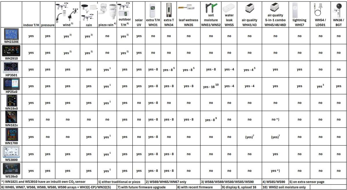 • HP2552* = HP2551 Konsole + WS68 Ausseneinheit + WH40 Regenmesser + WH32 Aussensensor + WH32B Innensensor (Froggit HP1000SE Pro Single Sensor)