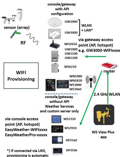 Es gibt grundsätzlich zwei Gerätearten: Konsolen und Sensoren. Welche Sensoren unterstützt werden, hängt von der jeweiligen Konsole ab. Die Konsole ist die Zentrale der Wetterstation, empfängt i.d.R.* per Funk die Signale aller dort angemeldeten Sensoren und verarbeitet diese weiter und sendet sie, falls vom Benutzer so gewählt, an bekannte Internet-Wetterdienste (Ecowitt Weather Cloud, Weather Underground, Weather Cloud, WOW) und an eine konfigurierbare Adresse (z.B. eigene Webpräsenz/website). Dabei muss eine Konsole nicht zwangsläufig auch einen Bildschirm haben. So sind ein GW1000, GW1100, GW2000, WH2650, WS6210, GW3000 vollwertige Konsolen - jedoch ohne Bildschirm.